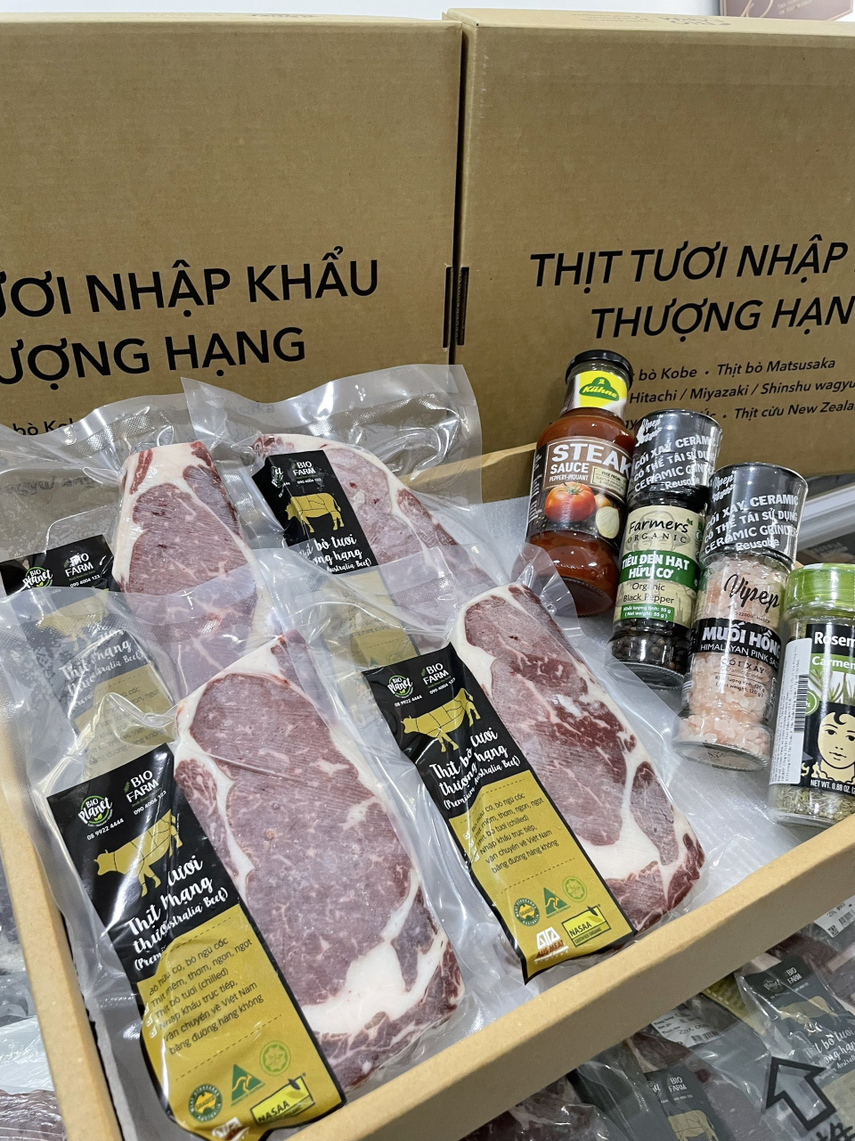 Đi kèm là bộ gia vị làm steak cao cấp giúp bạn dễ dàng chế biến món beefsteak chuẩn vị ngay tại nhà. Tất cả được đóng gói trong hộp quà và túi đựng sang trọng, kèm đá gel và giấy cách nhiệt giữ lạnh khi vận chuyển, rất thích hợp để biếu tặng người thân, bạn bè, đối tác trong các dịp lễ, sinh nhật hay những buổi sum họp ý nghĩa.